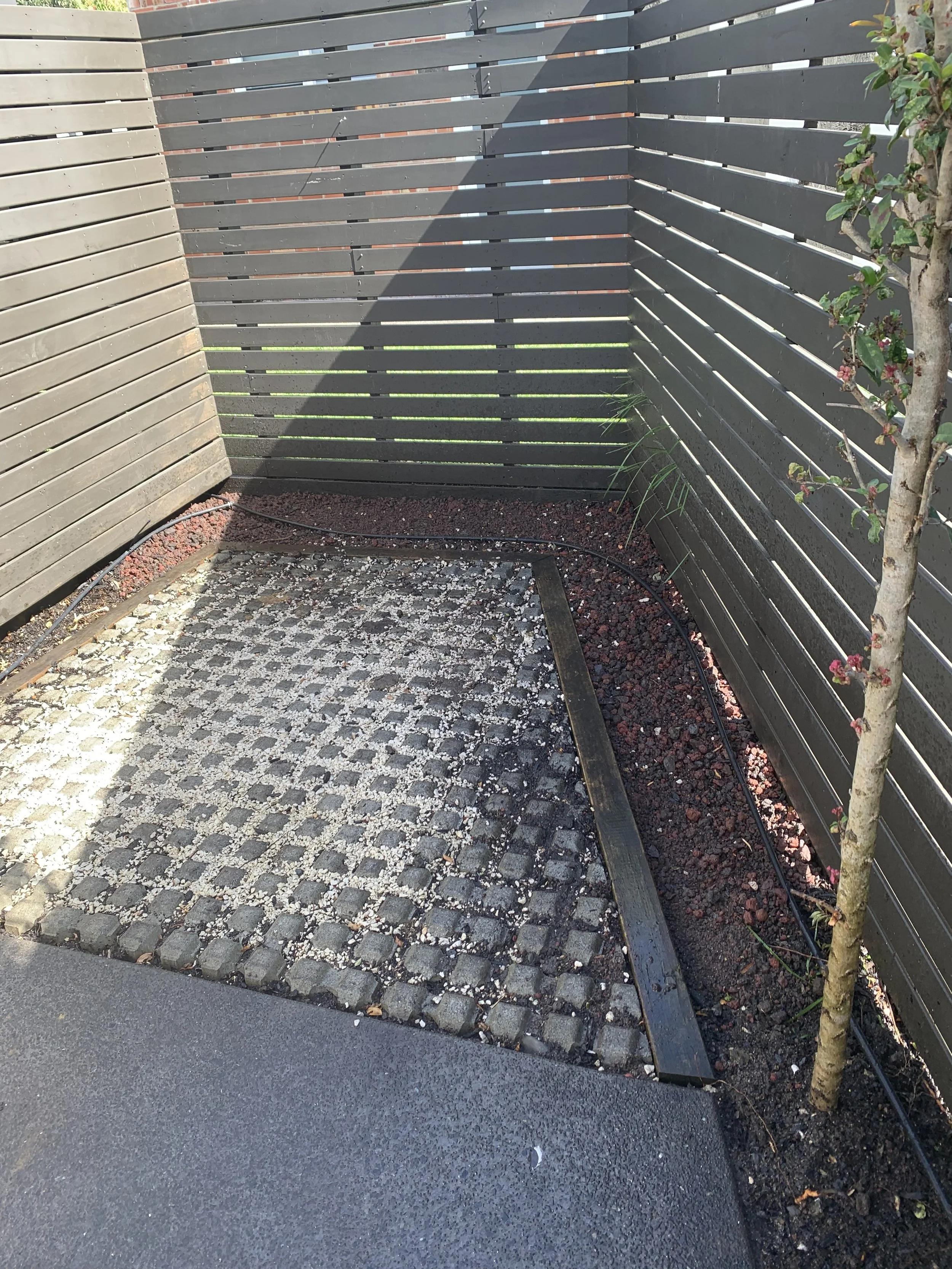 Being a very tight space to work in, the structure needed to be pre-fabricated then erected. Custom shelving was added. Fence palings were then attached to the front to blend the shed in with its surroundings.