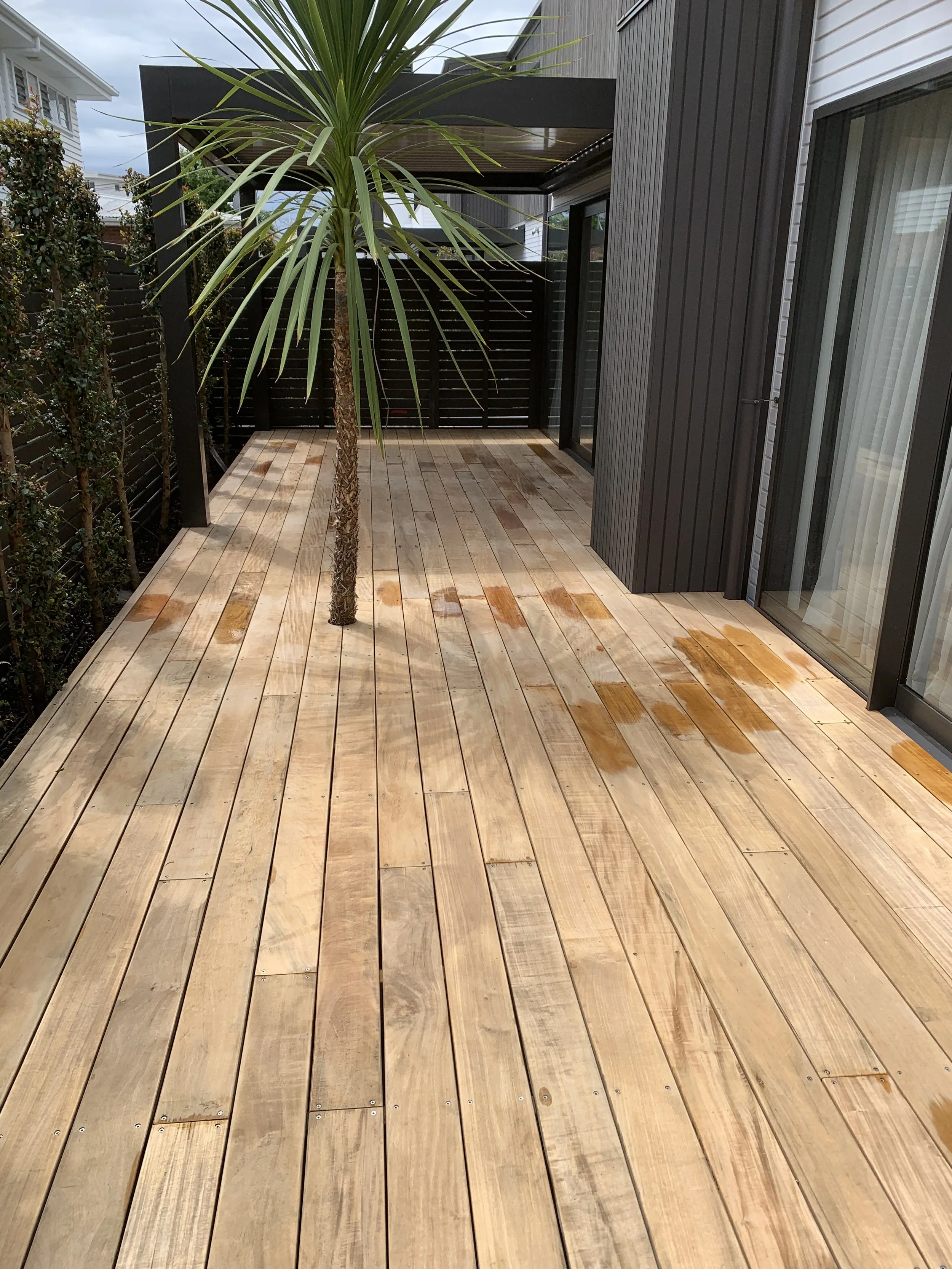 The initial brief was to install a floor level deck ¾ of the way along this back yard area. The client was so happy with the deck that he requested we extend it to the fence, leaving the cabbage tree in place.