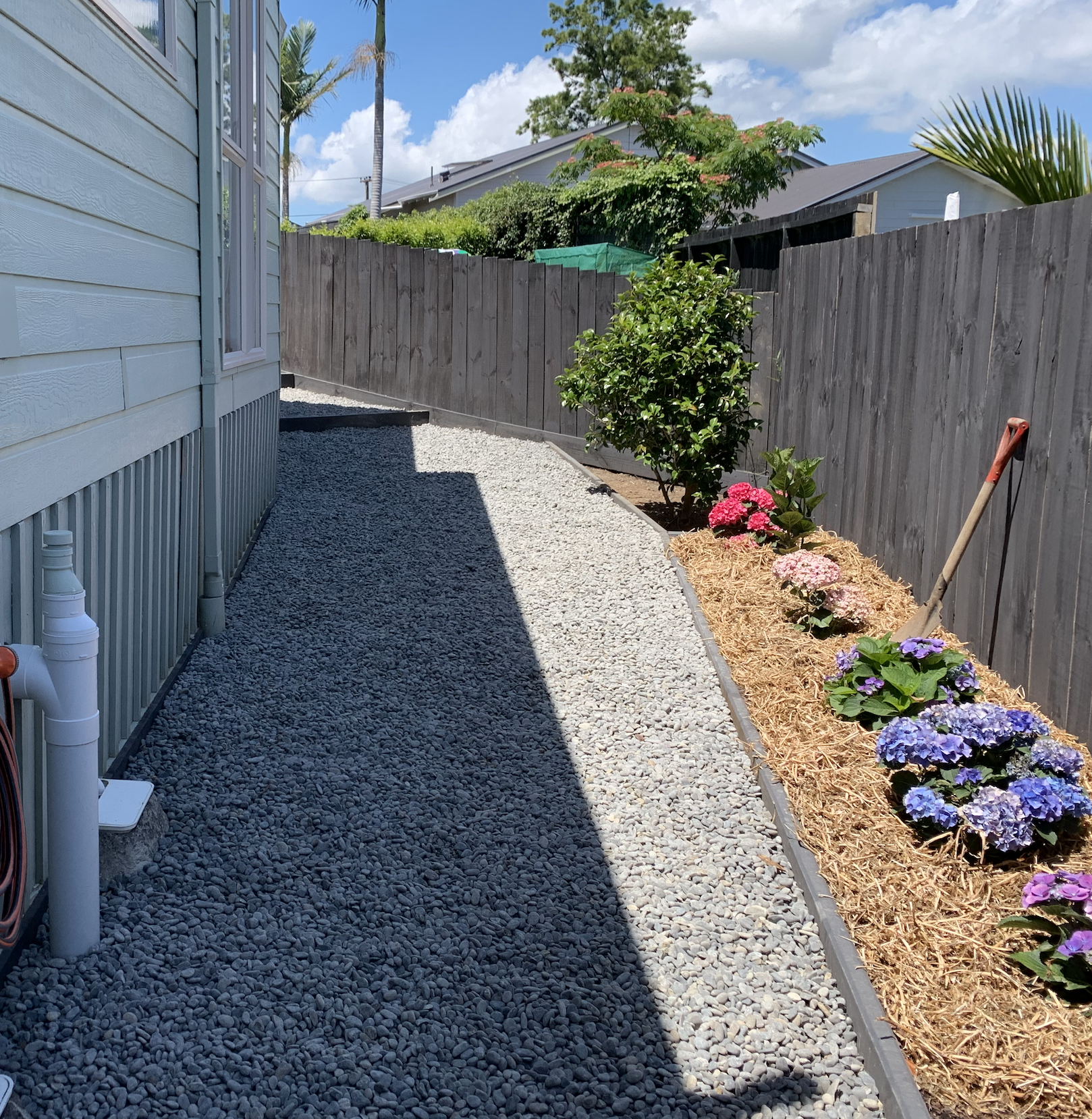 We completely landscaped right around the house by removing removing the unsightly concrete edging, adding steps, retaining walls and raised planters, with newly gravel filled pathways.